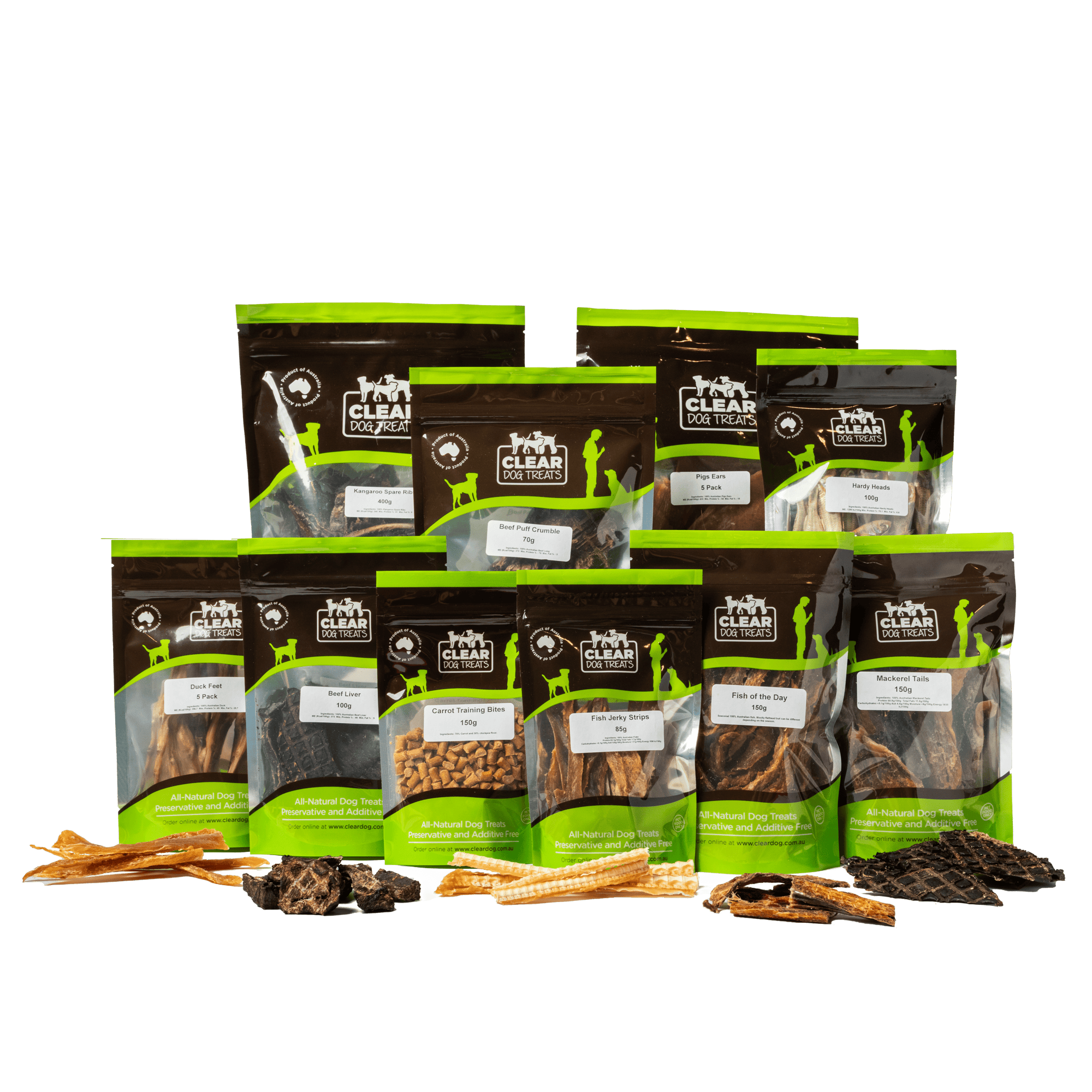 Assorted pack of natural dog treats made with wholesome ingredients for a healthy snack.